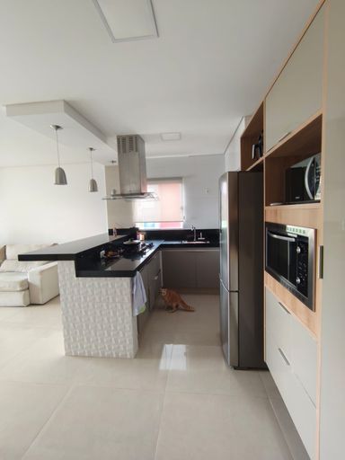 🍽 Cozinha americana com bancada em granito, cooktop, coifa de teto e forno elétrico